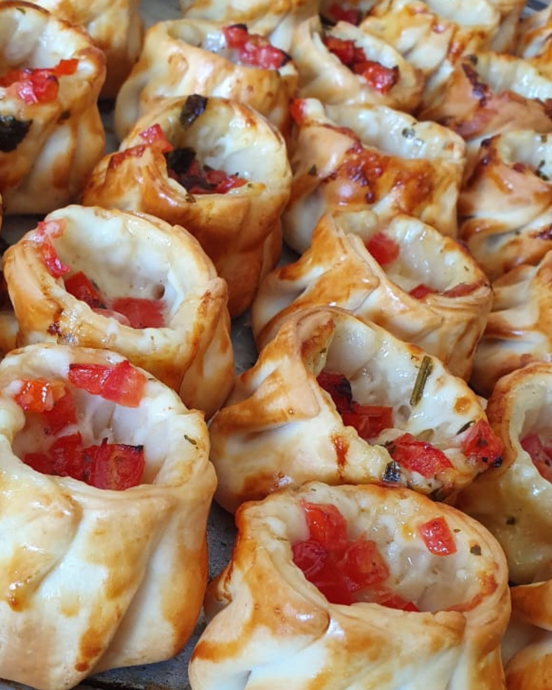 Canastitas con queso tybo, tomate, albahaca y aceite de oliva.